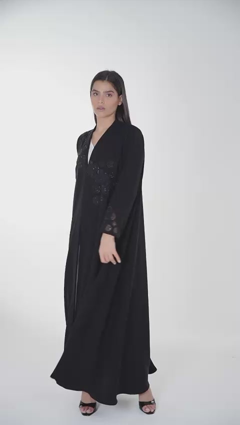 تحفة فنية من الأناقة، هذه العباءة السوداء مزينة بتطريز دائري متقن يخطف الأنظار مع كل حركة. يتدفق التطريز الرقيق برشاقة على الجهة الأمامية والأكمام، محققًا توازنًا راقيًا بين التراث والفن المعاصر.