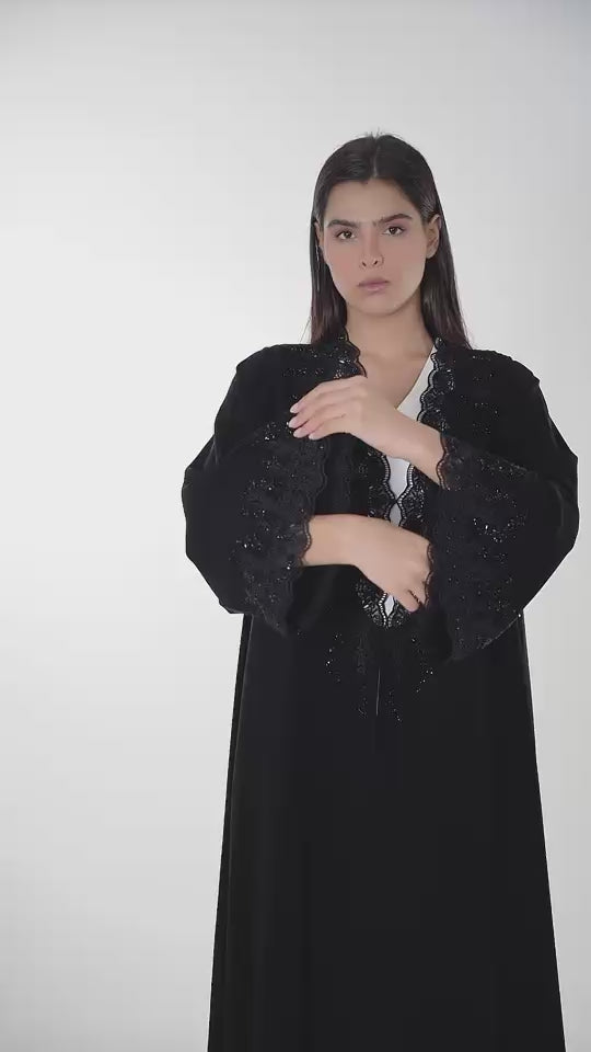 Exuding elegance, this black abaya features exquisite lace embroidery with delicate shimmer woven into its design. The wide sleeves and front detailing are adorned with intricate floral patterns, giving it a graceful and feminine charm.