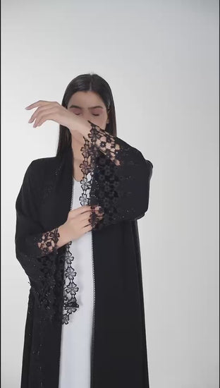 Black Abaya with Floral Lace & Subtle Beaded Embroidery