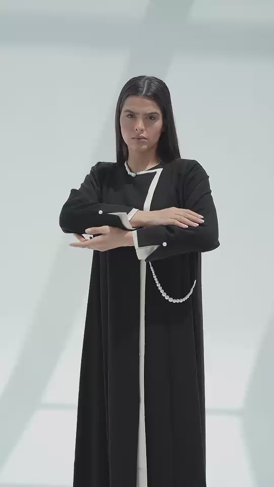 Modern and chic, this black abaya is elevated with a touch of sophistication through its contrasting white trim. A strand of delicate pearls drapes gracefully across the front, adding a unique detail that blends elegance with contemporary style.