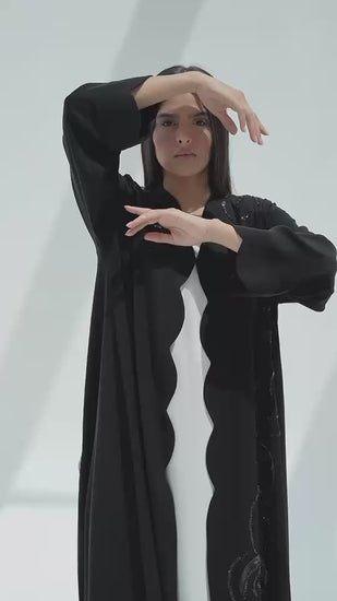 Ideal for evening events or formal gatherings, this abaya combines classic modesty with a unique touch of artistry. It’s a statement of grace and refined taste, designed for the modern woman.