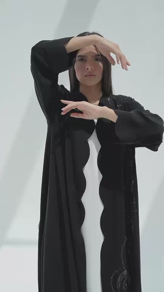 This black abaya is adorned with cascading matte-black sequins around the neckline, creating a beautiful layered effect that adds both texture and sophistication. The subtle shimmer of the sequins blends seamlessly with the fabric, making it a perfect piece for those who appreciate understated elegance.