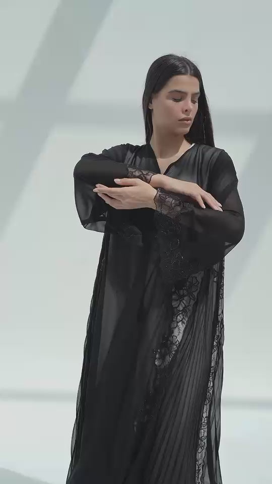 An abaya designed for the woman who loves elegance with a hint of allure. Crafted from lightweight sheer fabric, it flows effortlessly with every step, offering both comfort and sophistication.