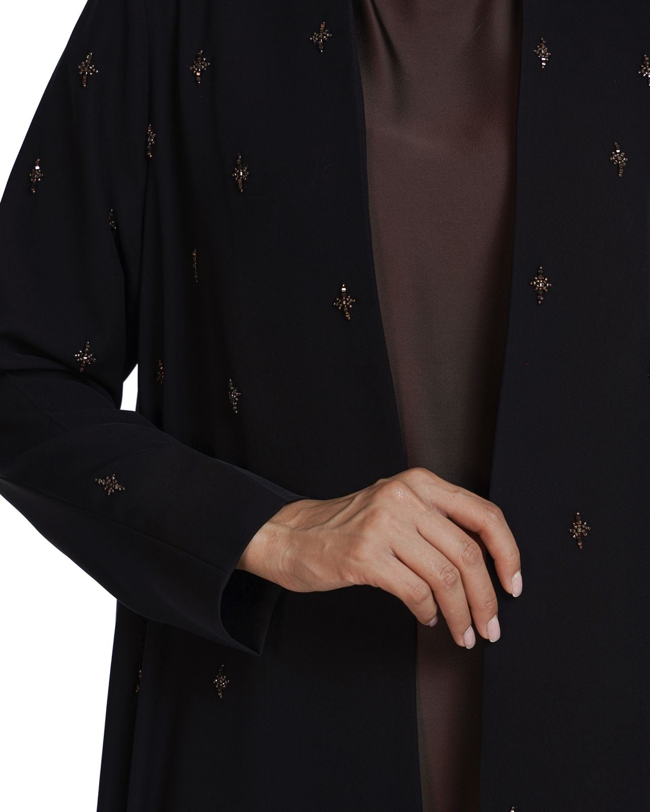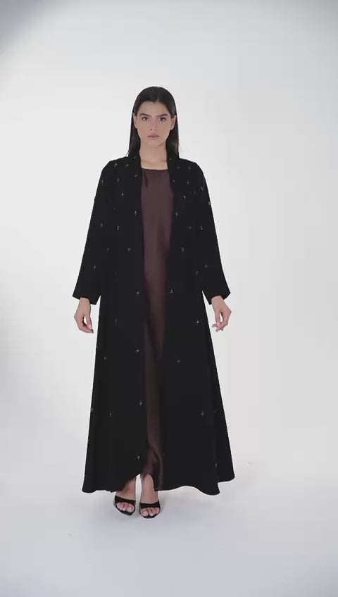 Elevate your evening look with this stunning black abaya, crafted from luxurious Barbie fabric for a soft and elegant drape. Featuring exquisite handwork in a rich brown—customizable to any color of your choice—this abaya is designed in a flattering umbrella cut that flows gracefully with every step. Perfect for date nights and special outdoor occasions, it’s a chic statement piece that combines sophistication with a touch of personalized charm.