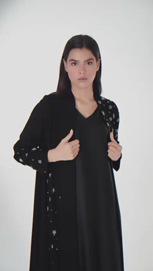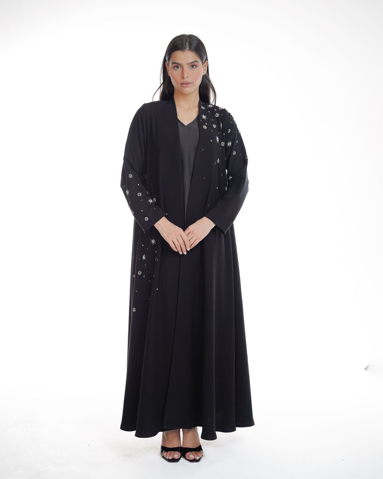 Black Abaya with Pearl & Crystal Floral Embellishments