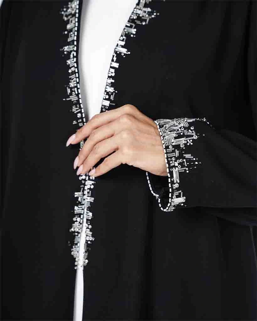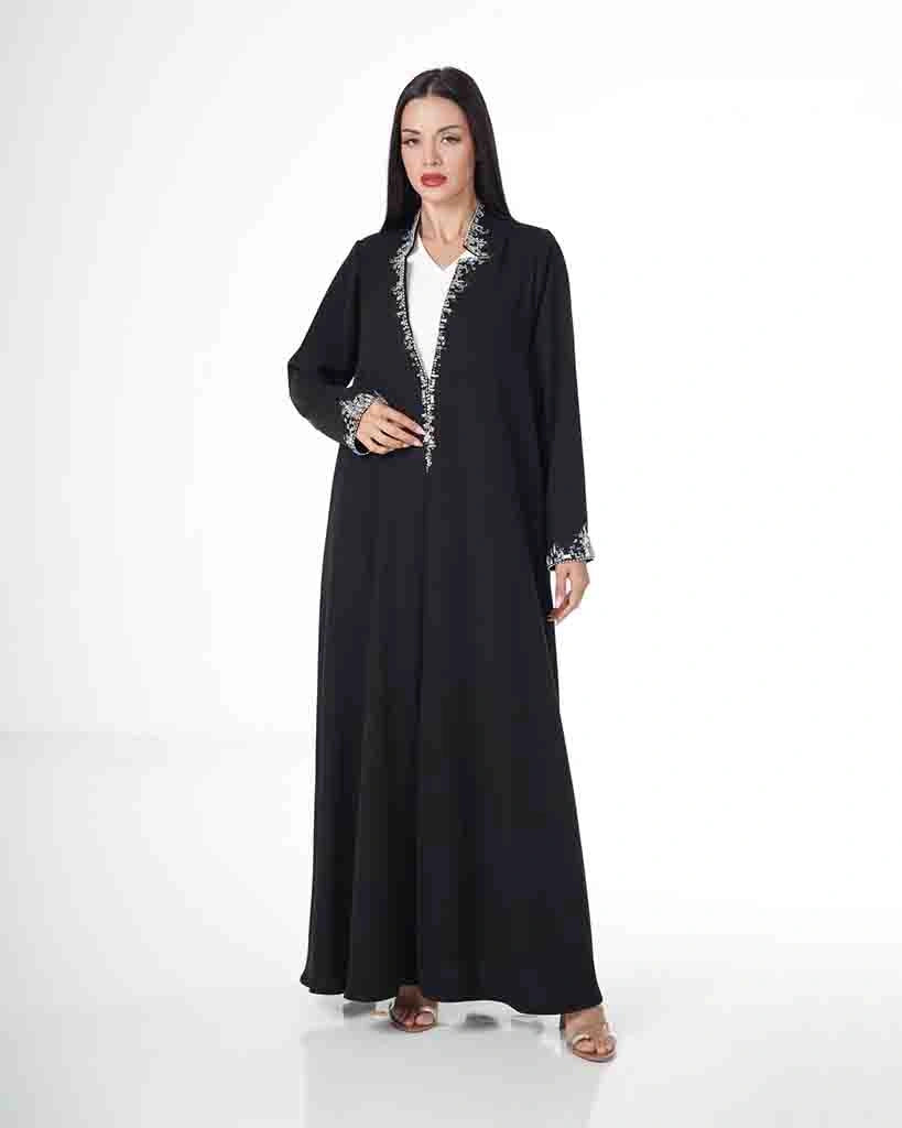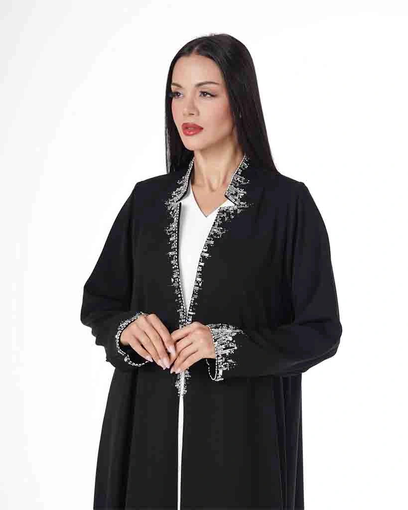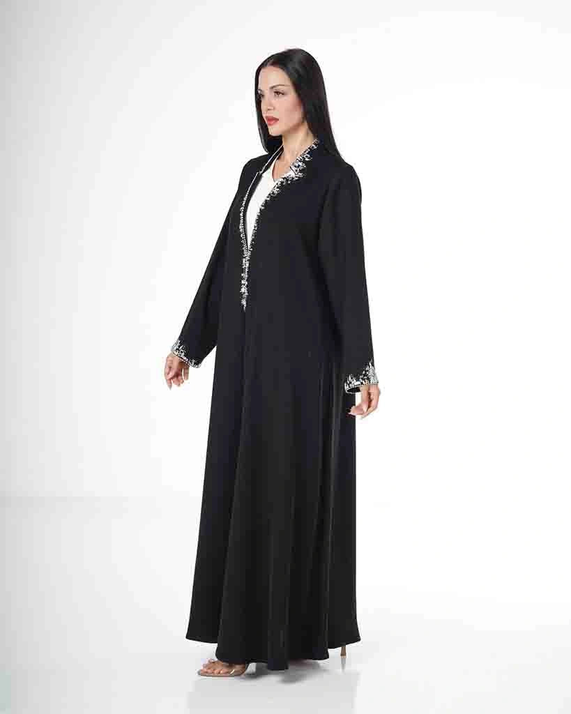 A luxurious black abaya featuring a soft, flowing silhouette, delicately accented with refined silver embroidery along the neckline and cuffs. A perfect blend of classic elegance and modern sophistication, designed for refined occasions and graceful everyday wear