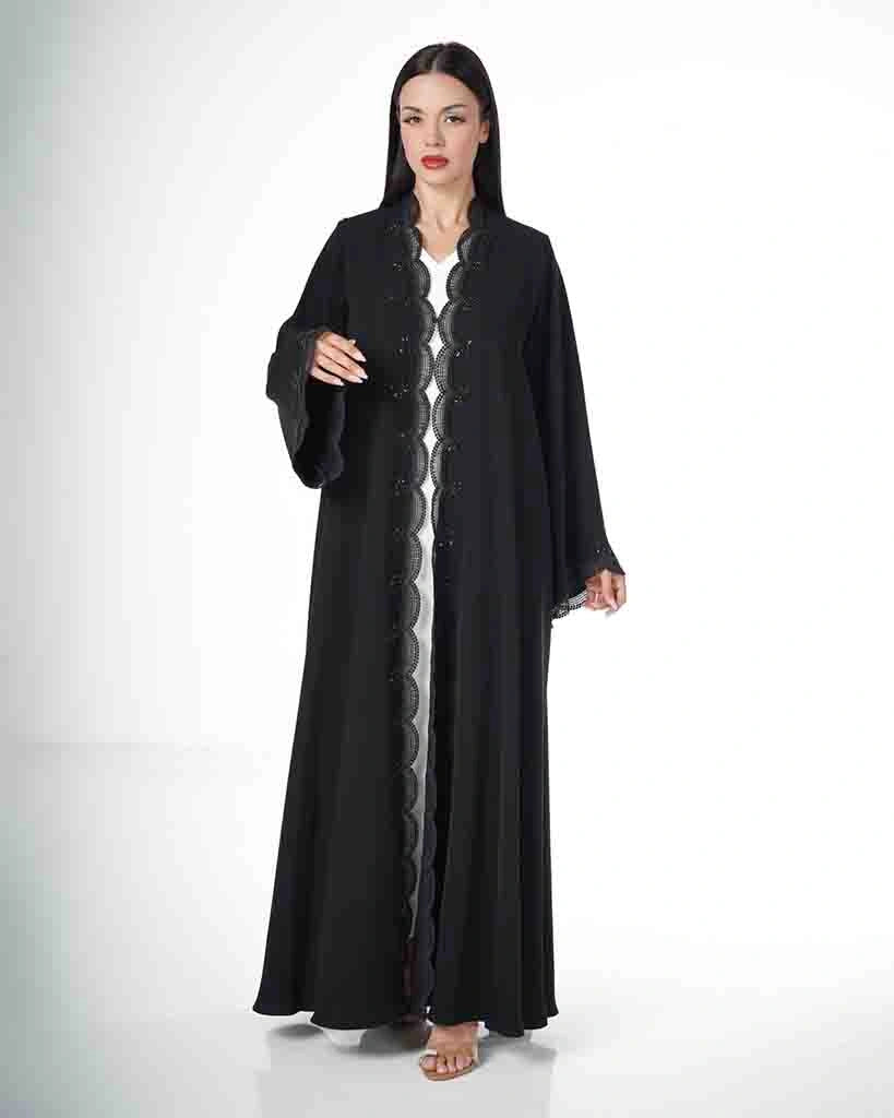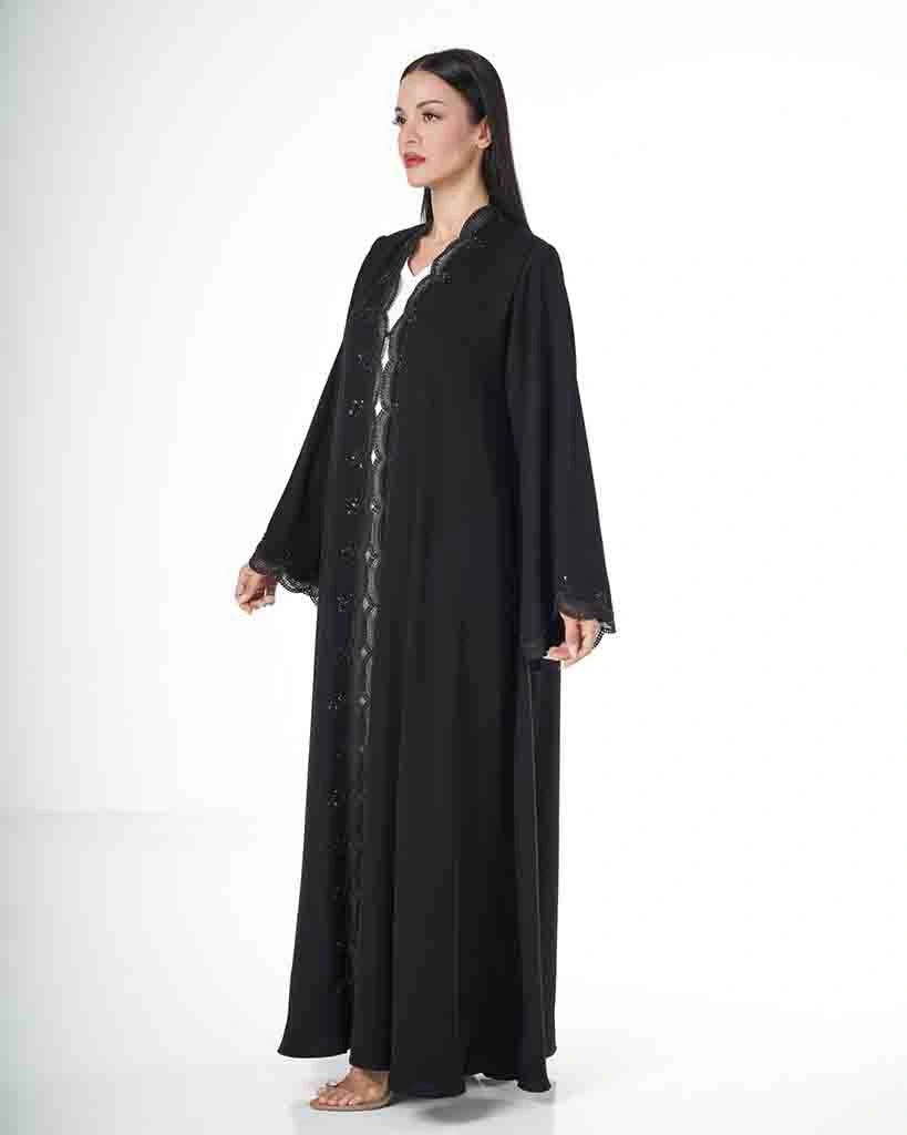 Elegant black abaya with a straight, full-length silhouette. Designed with subtle wavy embroidery along the front opening and sleeve edges. Crafted from a flowing fabric that offers both comfort and sophistication, making it a perfect choice for refined daily wear and special occasions.