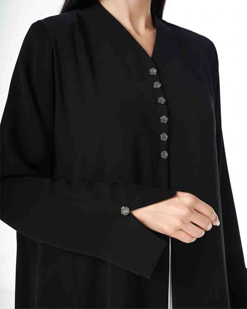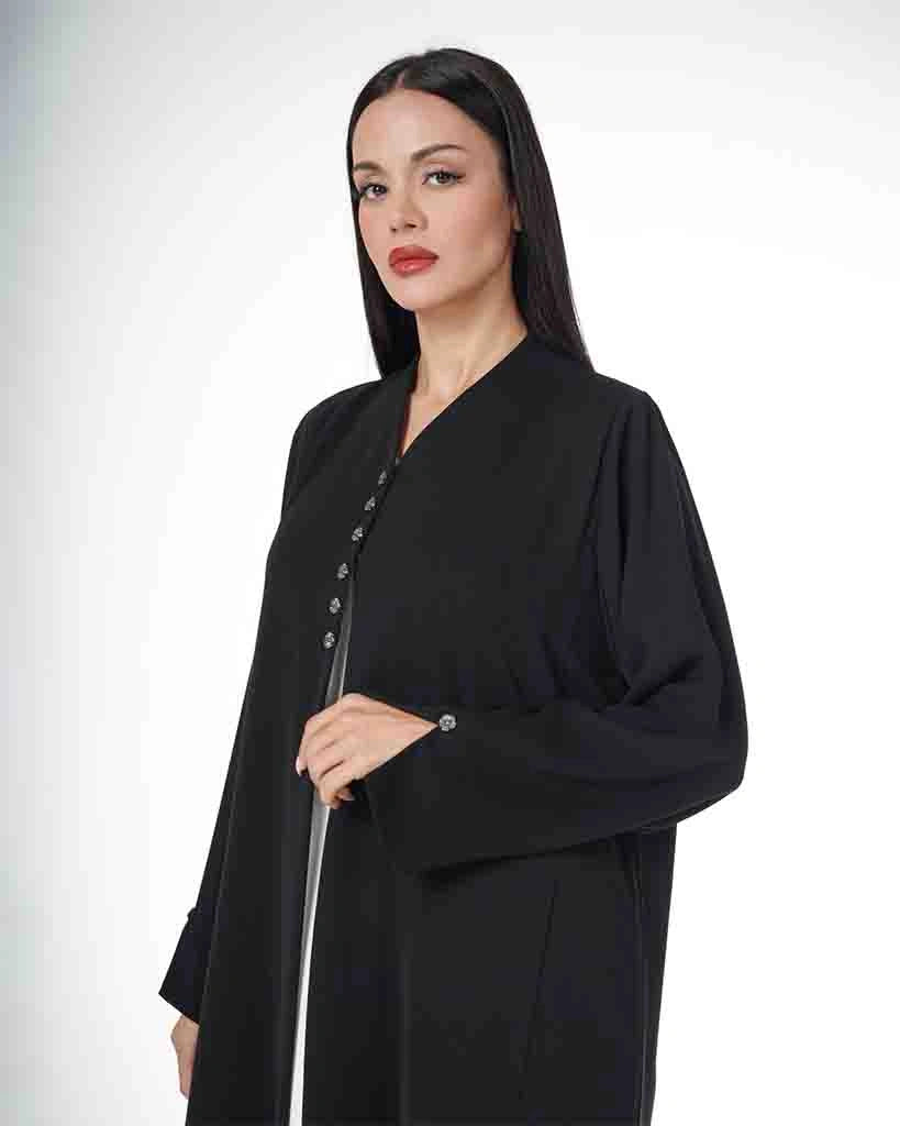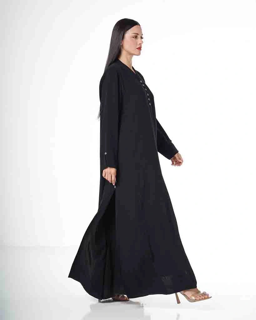 Classic black abaya with a straight, full-length silhouette, featuring subtle button details along the front for a refined and minimal look. Crafted from a lightweight, flowing fabric that offers comfort and elegance, making it ideal for everyday wear