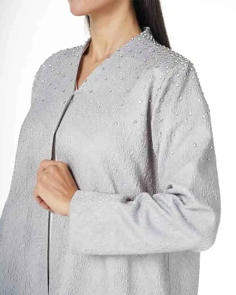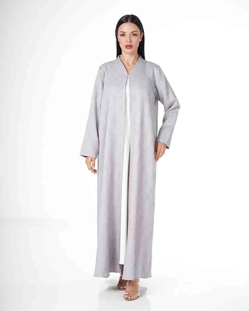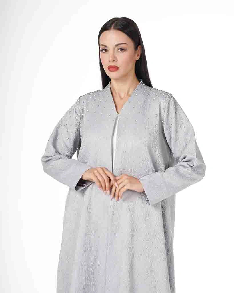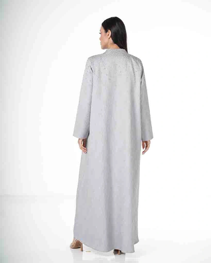 Elegant silver abaya with an open-front, full-length design that offers a graceful and flowing silhouette. Featuring delicate hand-beaded details on the upper part for a subtle touch of luxury. Crafted from a smooth, comfortable fabric, perfect for refined occasions and elegant gatherings.