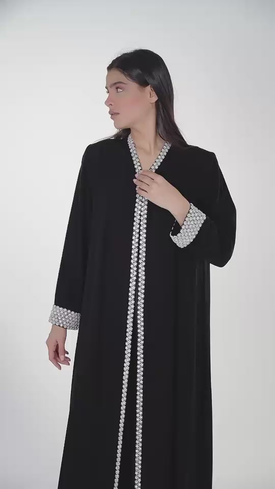Black Abaya with Full Pearl-Style Embellished Borders & Cuffs