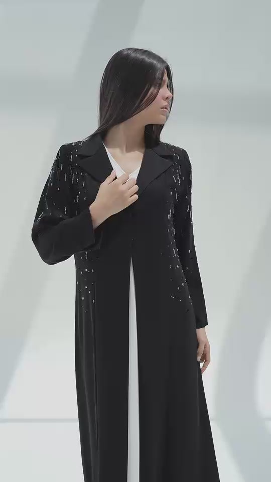 Chic and modern, this black abaya is elevated with delicate crystal embellishments scattered gracefully across the fabric. The shimmering details resemble falling droplets, adding a subtle sparkle that catches the light with elegance.
