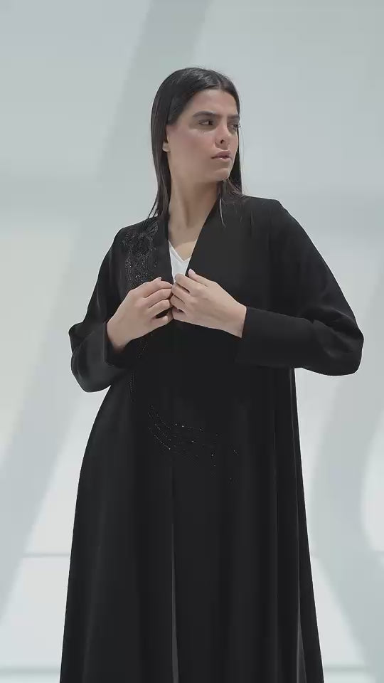 Sleek and refined, this black abaya is elevated with elegant bead embroidery that sweeps gracefully across the front in a flowing design. The subtle detailing adds depth and sophistication while keeping the overall look minimal and timeless.
