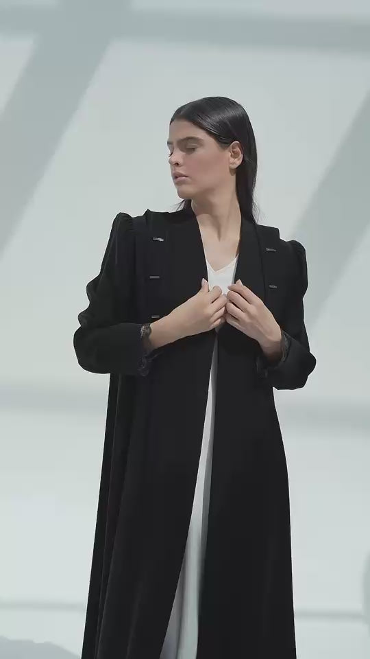 Sophistication in its most graceful form. This abaya features a structured cut with tailored shoulder accents, giving it a refined silhouette while maintaining effortless flow. The design is complemented by subtle stitched details along the front and delicate lace cuffs, adding a soft feminine touch.