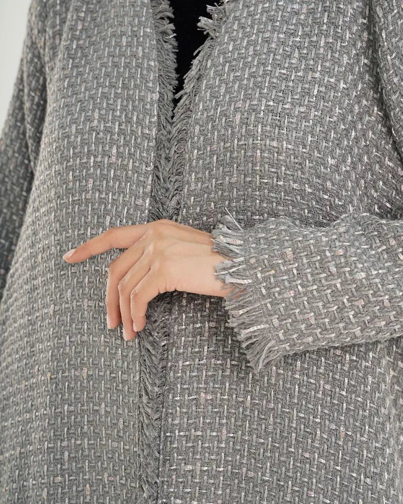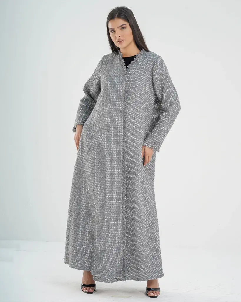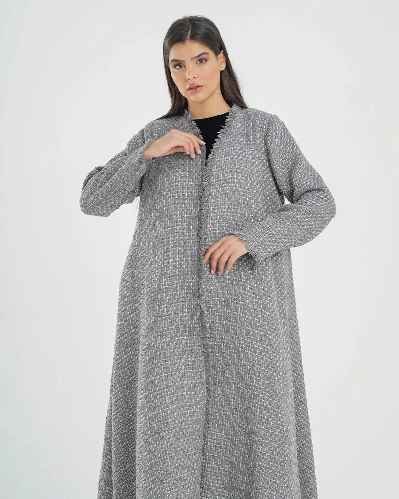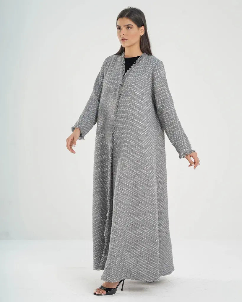 An elegant abaya in a soft grey color with a delicate pattern that adds a touch of luxury.