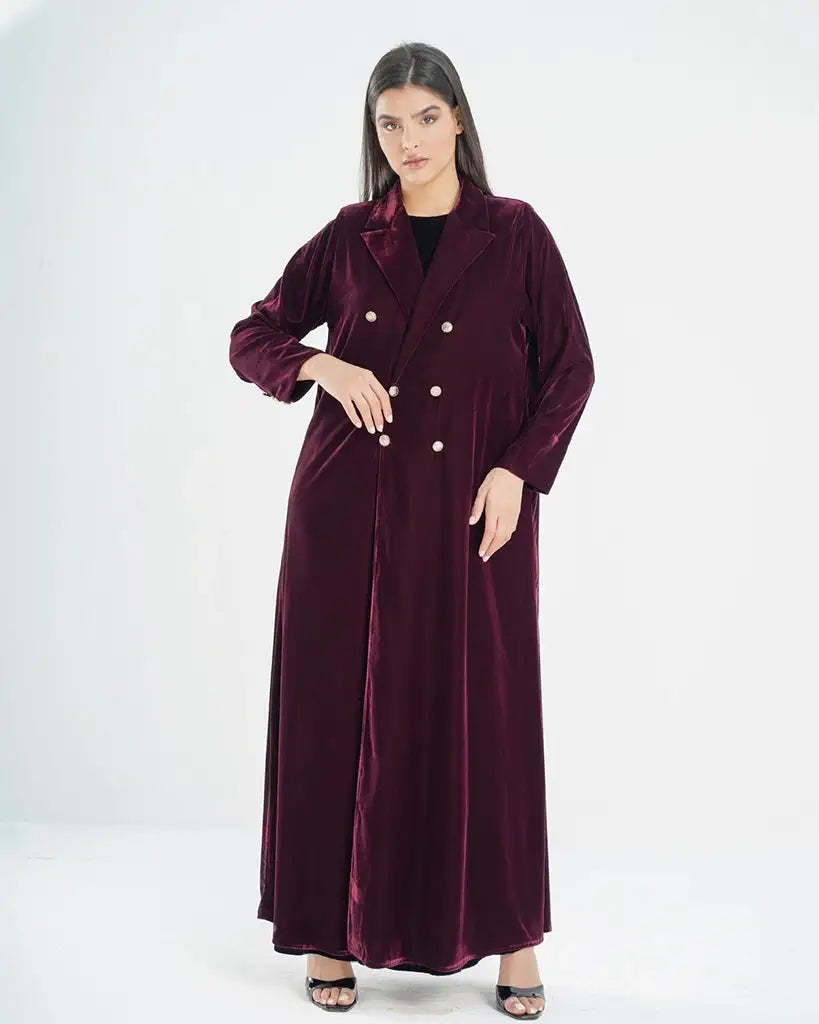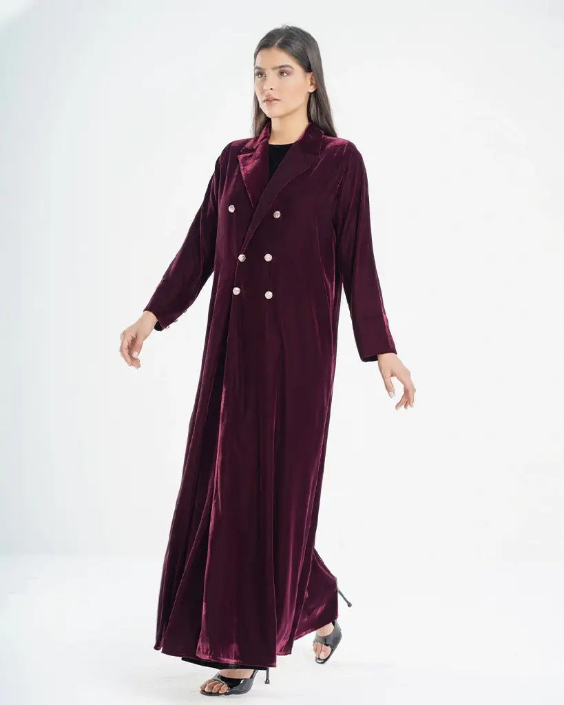 An elegant burgundy abaya made from a soft, slightly shiny fabric.